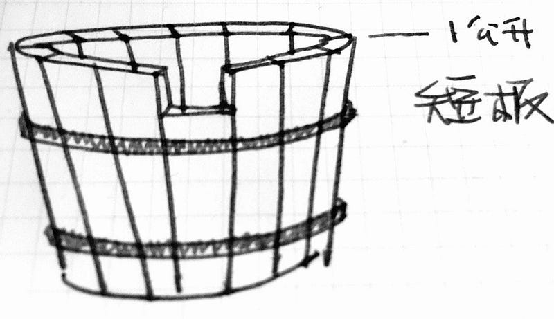 • 我給她畫了一個木板拼成的水桶(小孩沒看過這種水桶),其中一塊板子比較短。