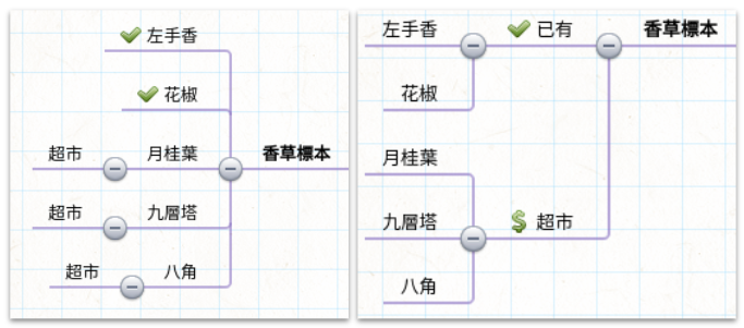 • 我要她把計畫用心智圖做出來,她把所有還沒取得的都加上「去超市買」,加了 3 次,我建議她可以把「超市」後面加上不同香草的子節點,這樣她學會了 refactoring,這就是找到共性,寫程式就需要找到不同事物的共同點,發現事物之間有共通點,是開始融合的第一步。