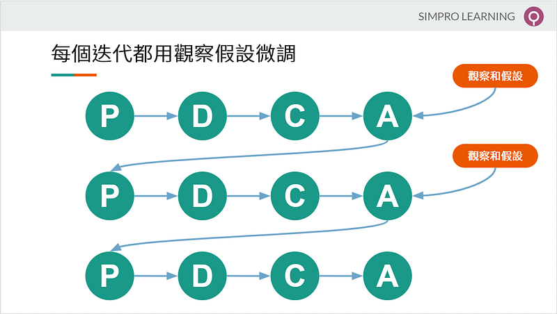 - 從這個例子你可以看到在哪裡用到 “觀察與假設”,就是在每次的 P 計畫之前用 C 反思得到哪裡做錯,用 A 得到下次修改的結論,再用新結論進行下次迭代。