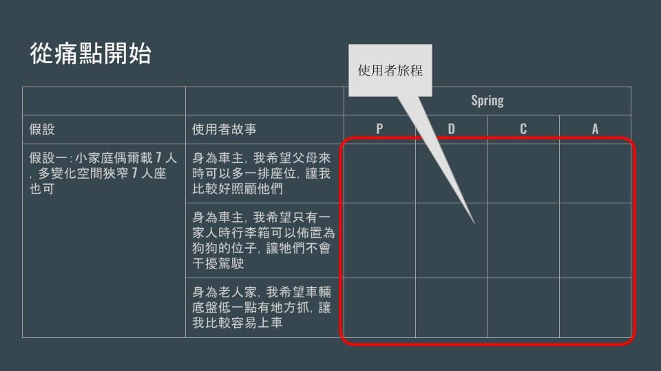 • 拿開發一台新車來說,你首先要發現一個「痛點」(pain point,在寫論文就是「開題」),我發現一般轎車只能載 5 人,但 7 人座的車又太大了,為了偶爾有需要載更多人的家庭,可以設計一台偶爾可以載 7 人的小轎車。