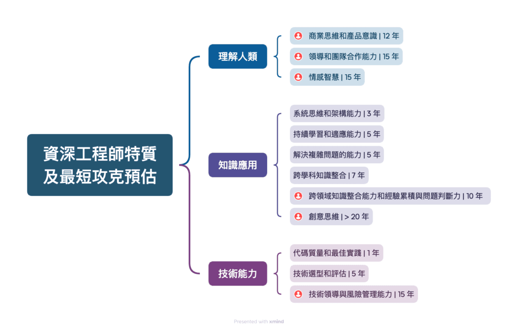 - 調查前想,資深工程師如果被要求帶團隊,我猜隨著累積的會議和行政事務,他的專業會跟不上快速發展,所以技術能力不會是他(比年輕工程師)的強項,反而在架構、用經驗預估(你這樣搞會結不了案哦!)、產品知識、領導上有更多磨練。