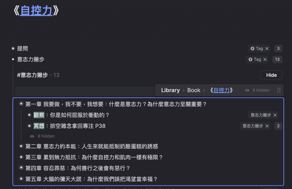 - RemNote 的 Portal 使用,我在讀《自控力》這本書時,發現它每一章節都會有幾個增加意志力的撇步,就在筆記上加了一個 Portal,顯示所有喔加有「意志力撇步」這個標籤的段落,就可以把相關內容整理在一起(圖片:六叔)