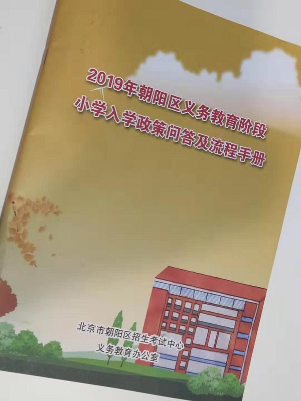 - 不想孩子壓力大,我租北京東邊朝陽區郊區,附近有個小小的溫馨小學,去學校打聽,沒人懂,警衛室發給我一本「政策」(就是臺灣的「簡章」),彩色印刷,看了覺得還挺有規模的,鉅細靡遺,應該沒什麼好擔心吧?他們這些人實在太庸人自擾了啊!我心裡想。