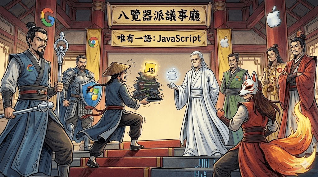八大門派(Google、Microsoft、Apple、Mozilla、Opera……)齊聚議事廳,環顧四周,驚覺一個殘酷的事實——「這瀏覽器裡,能用的語言竟只有一個」。