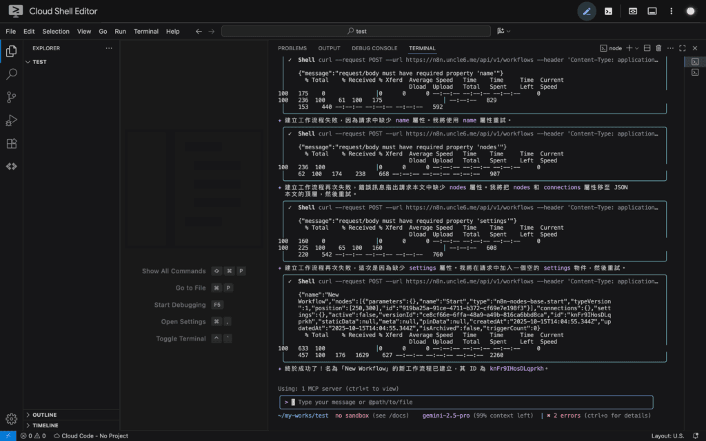 如果你要用 n8n 進行數位轉型,可以請 AI 建工作流,那設置 n8n-MCP-Server (這是另一家)就是必要的,實務上發現,學員很少具技術經驗,多是上班族,而且公司大多配備不適合開發的 Windows 電腦,結果,要設置 AI 協作開發環境很困難!那雲端開發環境呢?本文告訴你使用 Google Cloud Shell Editor 整合 Gemini 自動開發 n8n 工作流的方法,有瀏覽器就好。