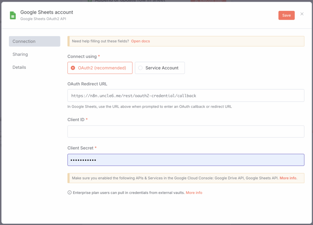 - Set up for use in HTTP Request node:開啓,你就可以用 n8n 內建的 http request 節點來呼叫所有 Google 服務提供的 API(理解為什麼2)。