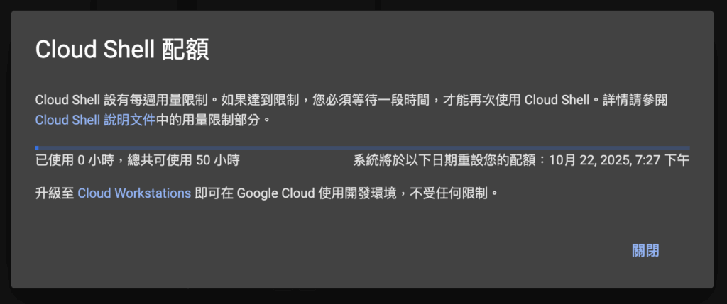 • 啟動 Cloud Shell :點擊頁面右上角的 >_ 圖示(像一個終端機符號)。