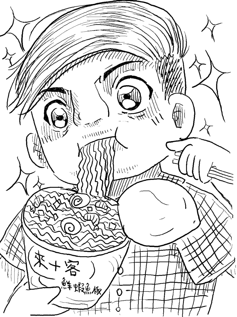 - 等了 Crick 好久以後,六叔開始吃泡麵,這時 Crick 突然開始說話了,泡麵吞不下去(插圖創作:[謝和言](https://www.facebook.com/profile.php?id=100071550817311))